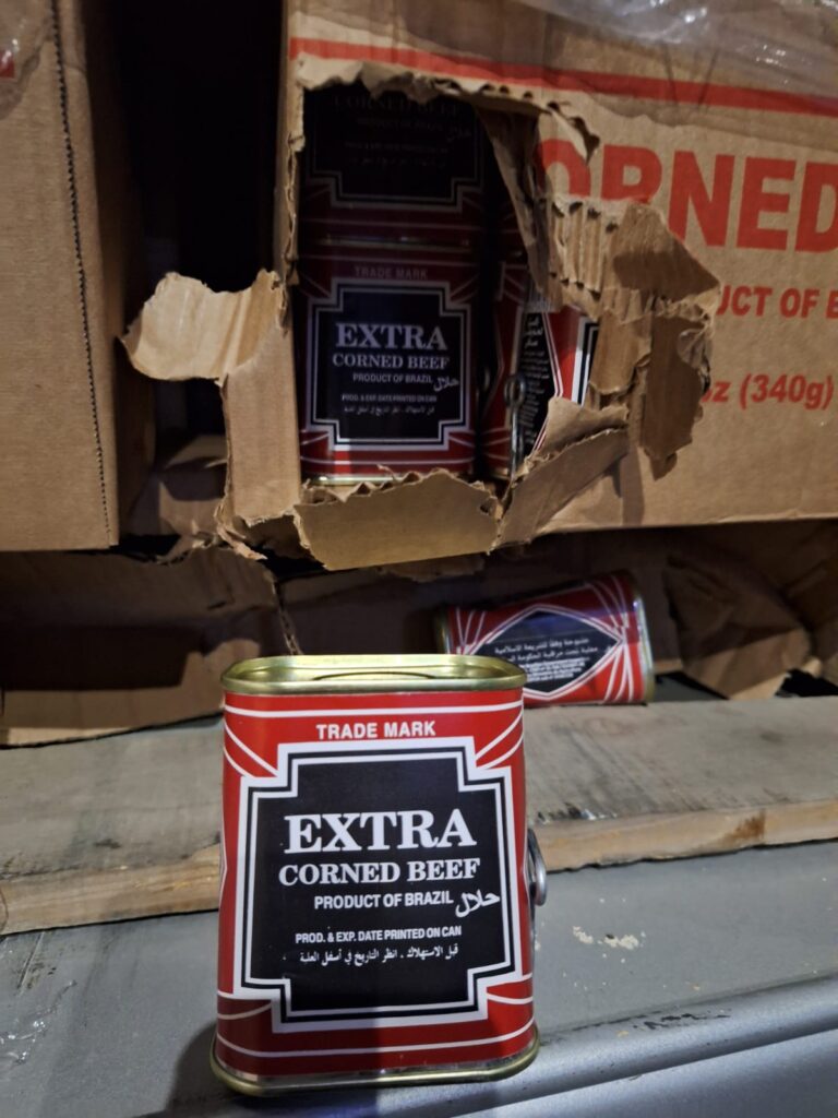 קופסאות השימורים הובלו על גבי 25 משטחים במשאית שעשתה דרכה ממישור אדומים לבאר שבע • נהג המשאית טוען כי "לא ידע מה הועמס על המשאית", והמקרה הועבר לחקירה • הבשר הוחרם והועבר להשמדה